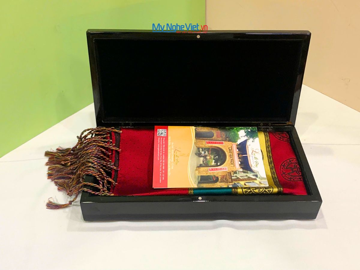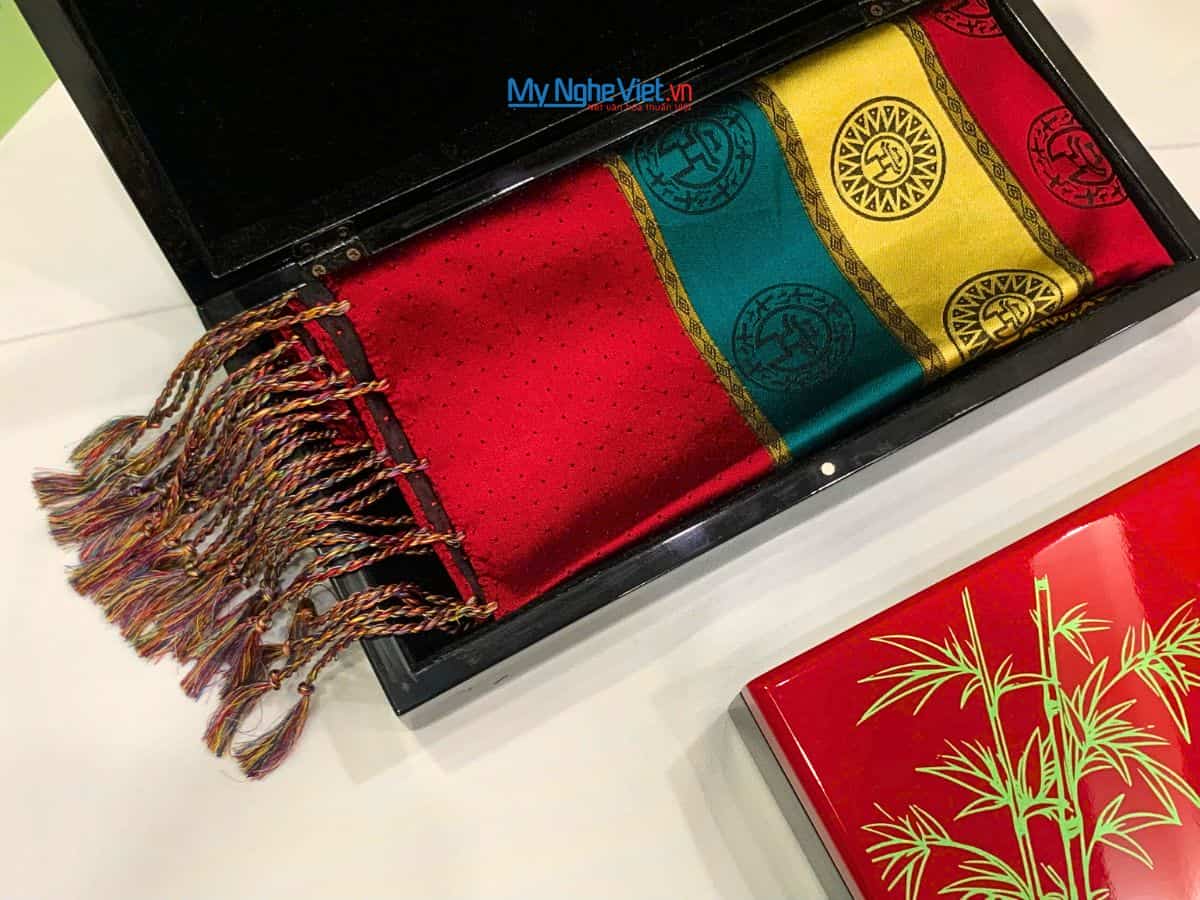 Hộp sơn mài được làm từ làng sơn mài Bình Dương kết hợp với khăn lụa từ làng Vạn Phúc (Hà Đông) chính là điểm phối hợp độc đáo, mới lạ của món quà này. Trước đây sơn mài được gói bằng hộp carton thô cứng, còn khăn lụa được đựng trong một chiếc hộp của riêng nó trông rất nhạt nhẽo và vô vị. Trải qua nhiều giai đoạn, chúng tôi hiểu rằng khách hàng của mình cần có một sự đổi mới và khác biệt trong việc lựa chọn quà tặng vì vậy Mỹ Nghệ Việt đã kết hợp giữa sơn mài và lụa, tạo nên một bộ quà tặng hoàn toàn mới, thay vì trước đây khăn lụa chỉ được đựng trong một chiếc hộp bình thường thì ngày nay nó được thay vào là hộp sơn mài, vừa độc đáo, vừa sang trọng, chắc hẳn đây chính là món quà bạn đừng nên bỏ lỡ khi lựa chọn quà tặng cho đối tác, cho sếp hay cho một khách hàng quan trọng nào đó