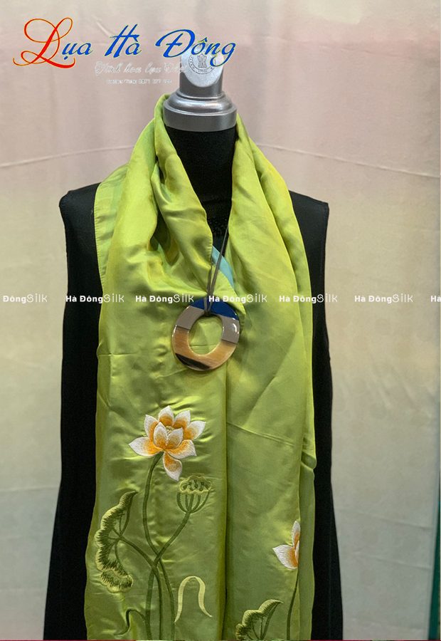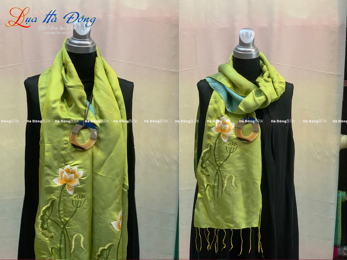 Khăn lụa từ lâu đã trở thành phụ kiện không thể thiếu trong tủ đồ của người phụ nữ, góp phần tôn lên vẻ đẹp sang trọng, quý phái và đầy tinh tế. Nổi bật trong số đó là khăn lụa tơ tằm thêu sen. Một sự kết hợp hoàn hảo giữa nghệ thuật và thủ công Việt Nam. Với thương hiệu Lụa Hà Đông do Mỹ Nghệ Việt phân phối tại thị trường Hồ Chí Minh. Chúng tôi tự tin mang đến cho Quý khách những sản phẩm lụa Việt được các nghệ nhân làng nghề thủ công sản xuất chính gốc.