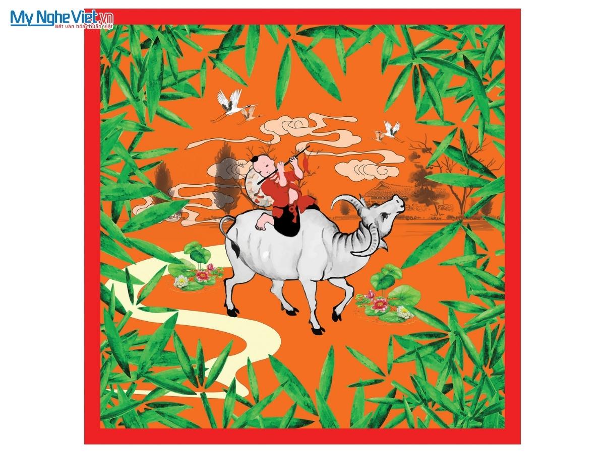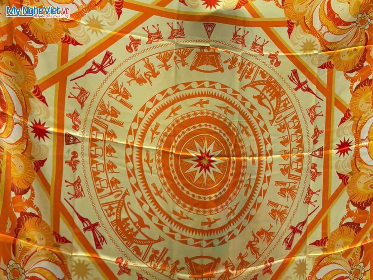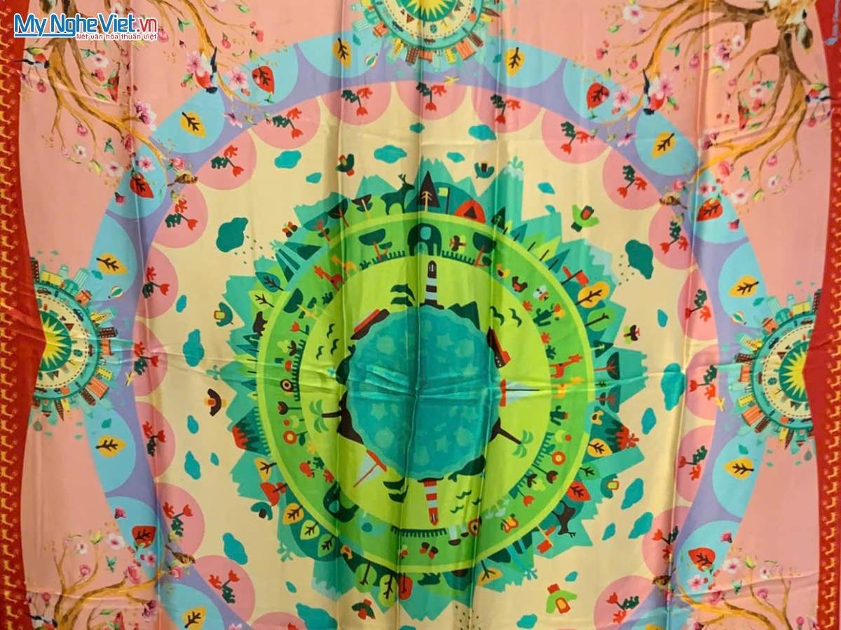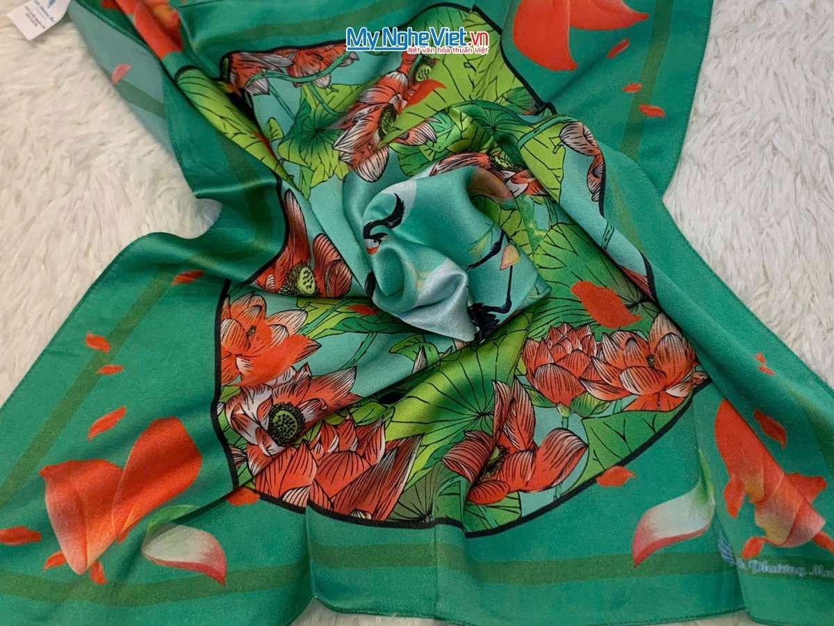 Khăn được làm từ 100% tơ tằm tự nhiên, mang đến cảm giác mềm mại, nhẹ nhàng và thoáng mát khi sử dụng. Bề mặt vải lụa có độ bóng nhẹ đặc trưng giúp các họa tiết in trở nên sắc nét và nổi bật hơn.