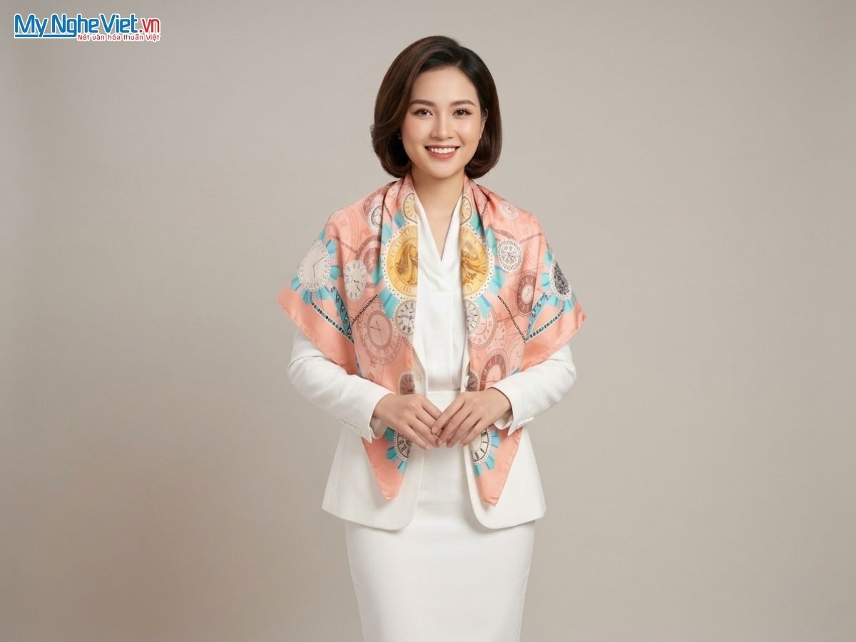 Kích thước 100x100cm là kích thước phổ biến của khăn lụa vuông, mang lại sự linh hoạt trong nhiều cách sử dụng khác nhau.