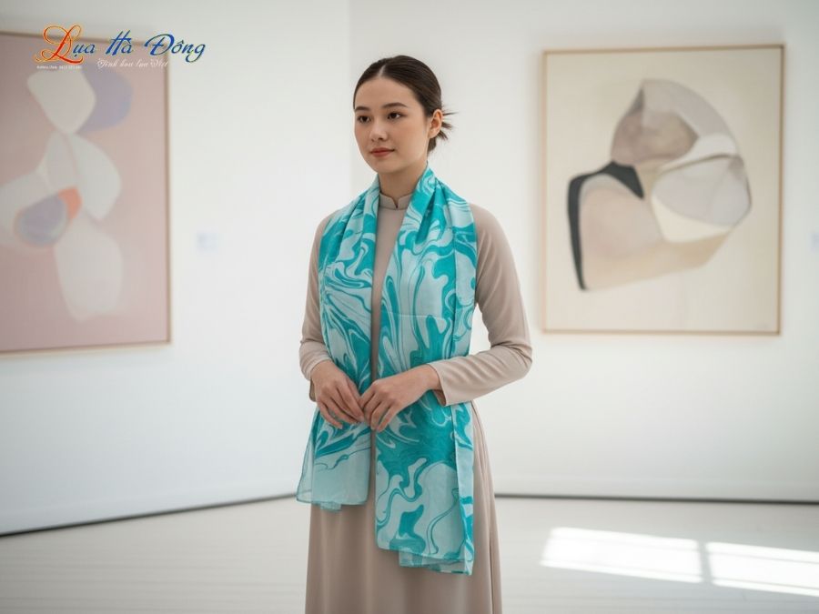 Khăn lụa tơ tằm Thủy Ấn là dòng phụ kiện cao cấp được tạo ra bằng kỹ thuật vẽ trên mặt nước (Thủy ấn họa). Thay vì dệt họa tiết hay thêu tay thông thường, người nghệ nhân sẽ tạo hình các dải màu loang trên một dung dịch đặc biệt, sau đó khéo léo đặt tấm lụa tơ tằm trắng lên bề mặt để “bắt” lấy những đường vân sắc màu.