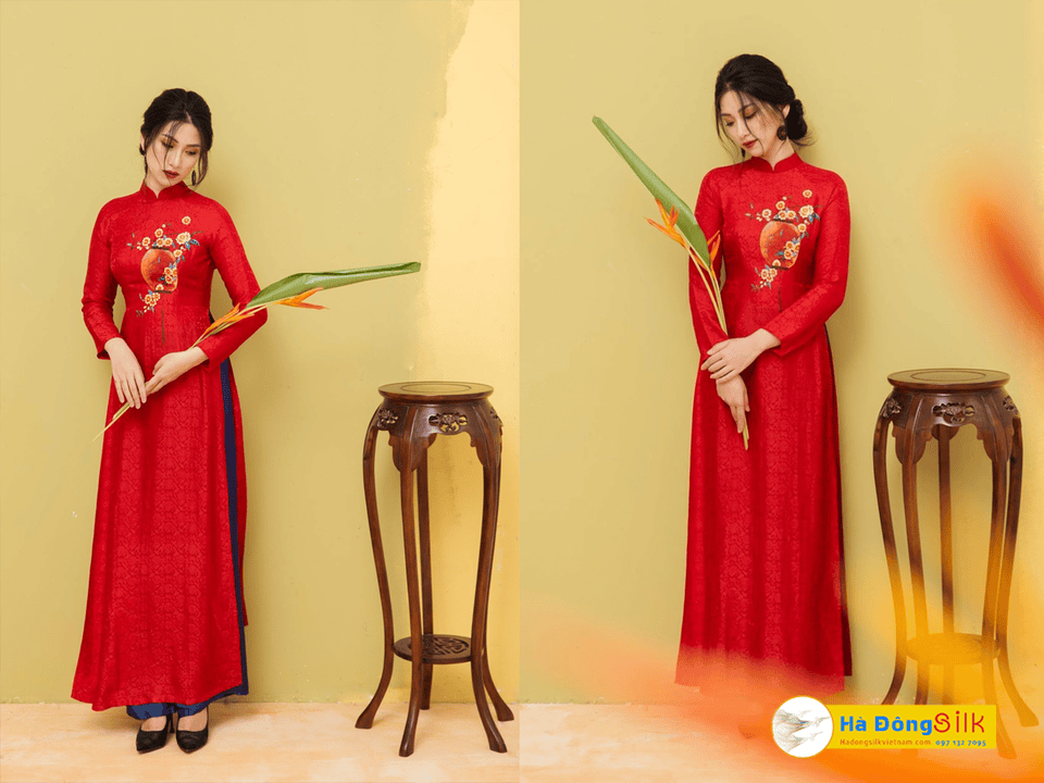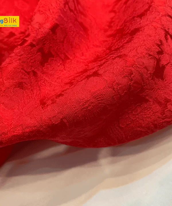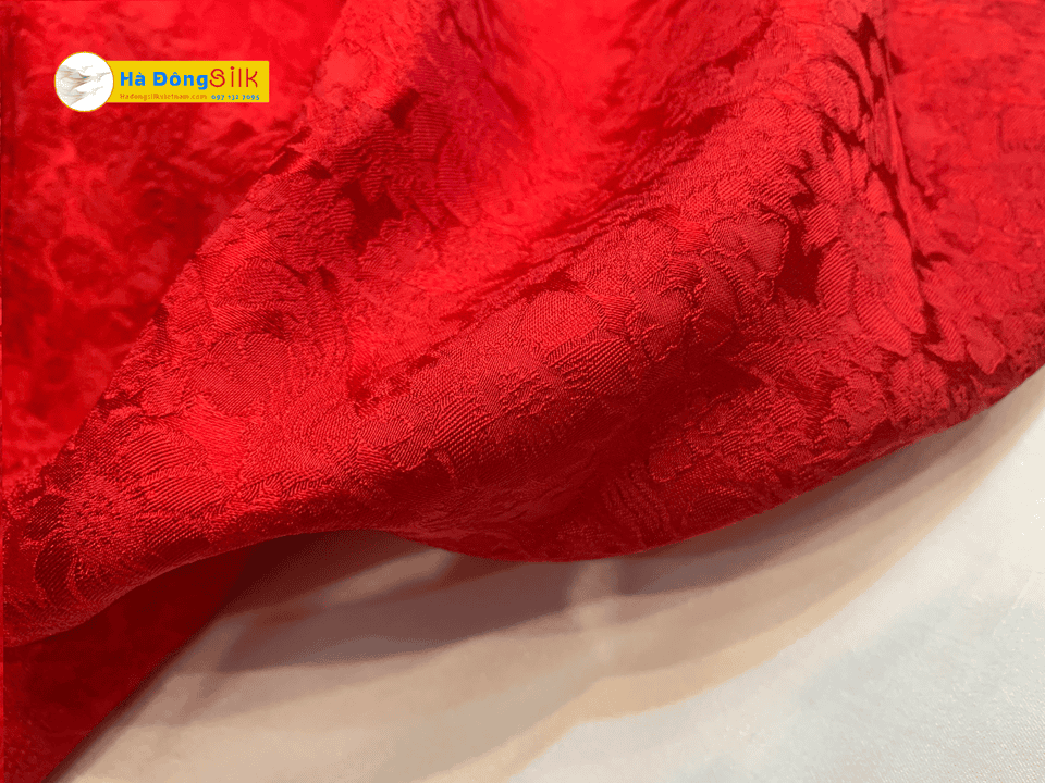 - Vải lụa Hà Đông với gam màu đỏ truyền thống cùng với họa tiết hoa cúc đầy tinh tế toát lên nét thanh nhã dịu dàng.