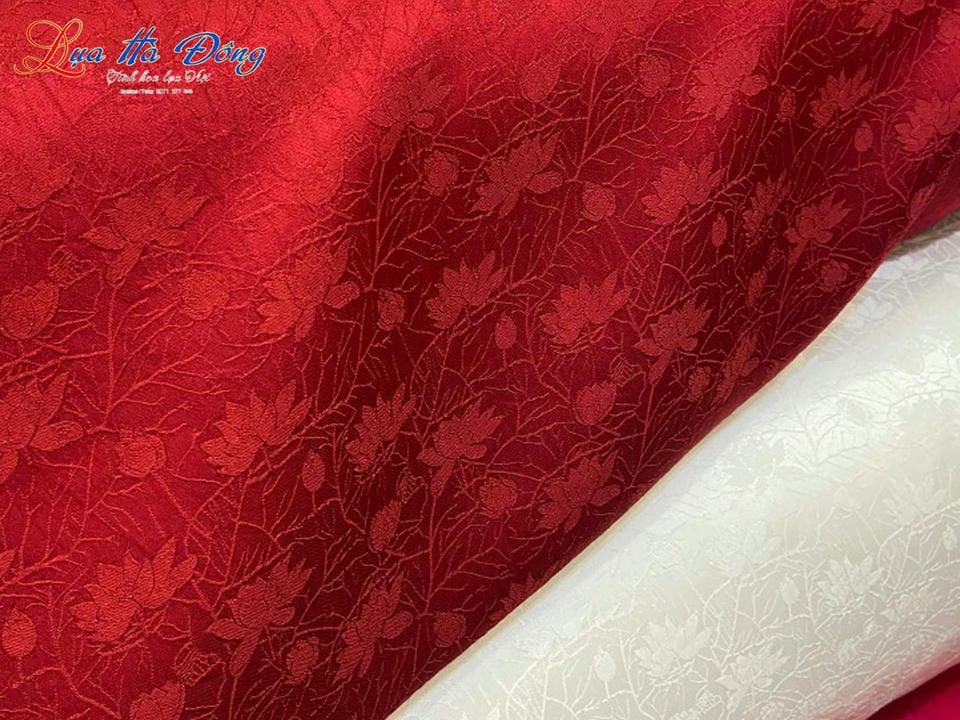 - Vải lụa Hà Đông với gam màu đỏ truyền thống cùng với họa tiết hoa sen đầy tinh tế toát lên nét thanh nhã dịu dàng và truyền thống.